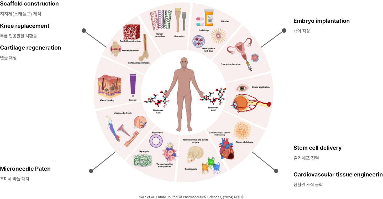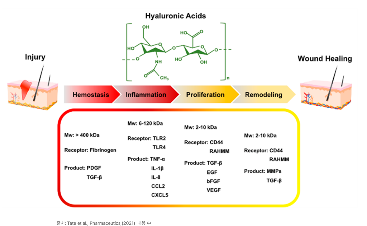 히알루론산은 우리 몸 ECM(Extracellular Matrix)의 주성분이고, 창상치유의 각 단계에서 적용되는 히알루론산은 특정한 분자량대의 것들이 사용됩니다.
